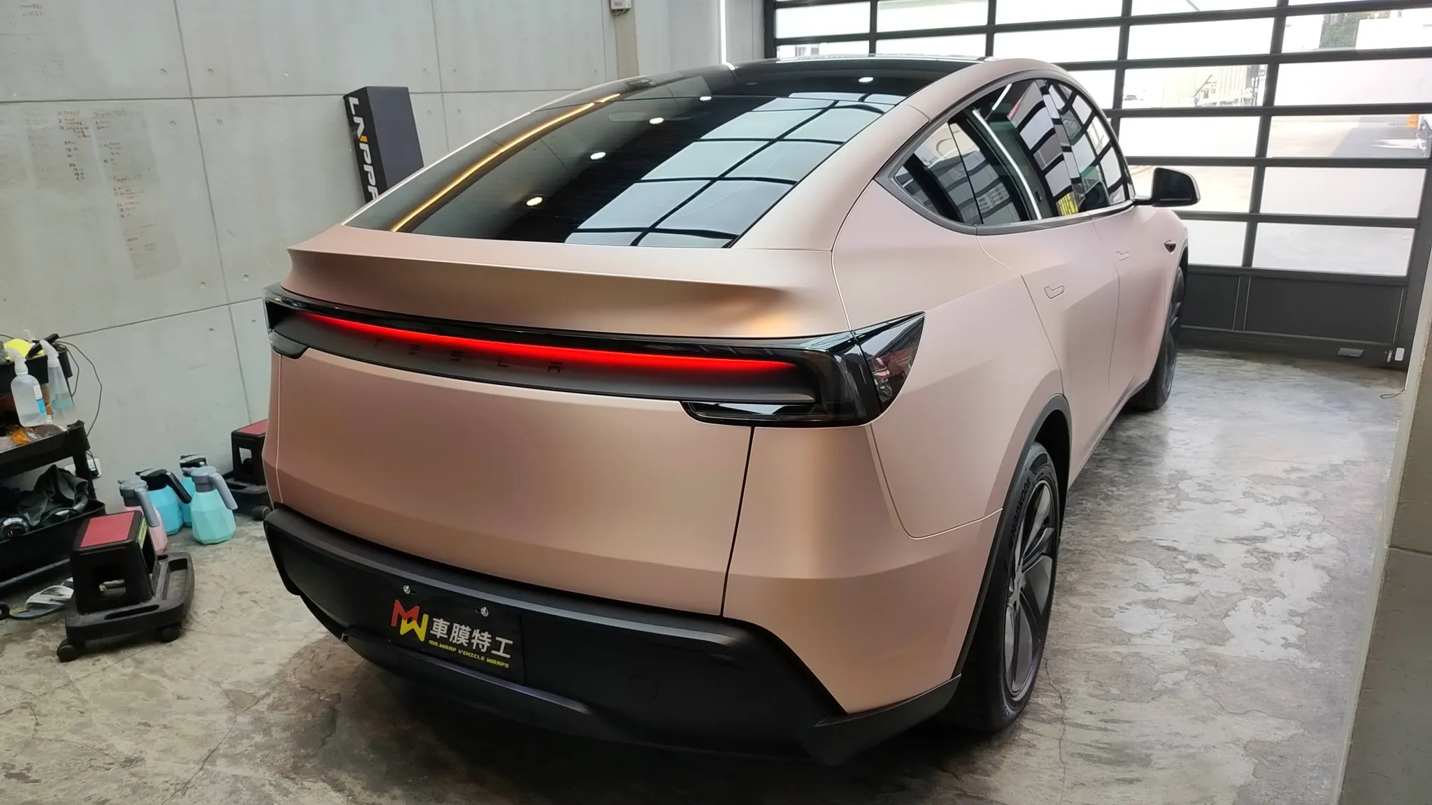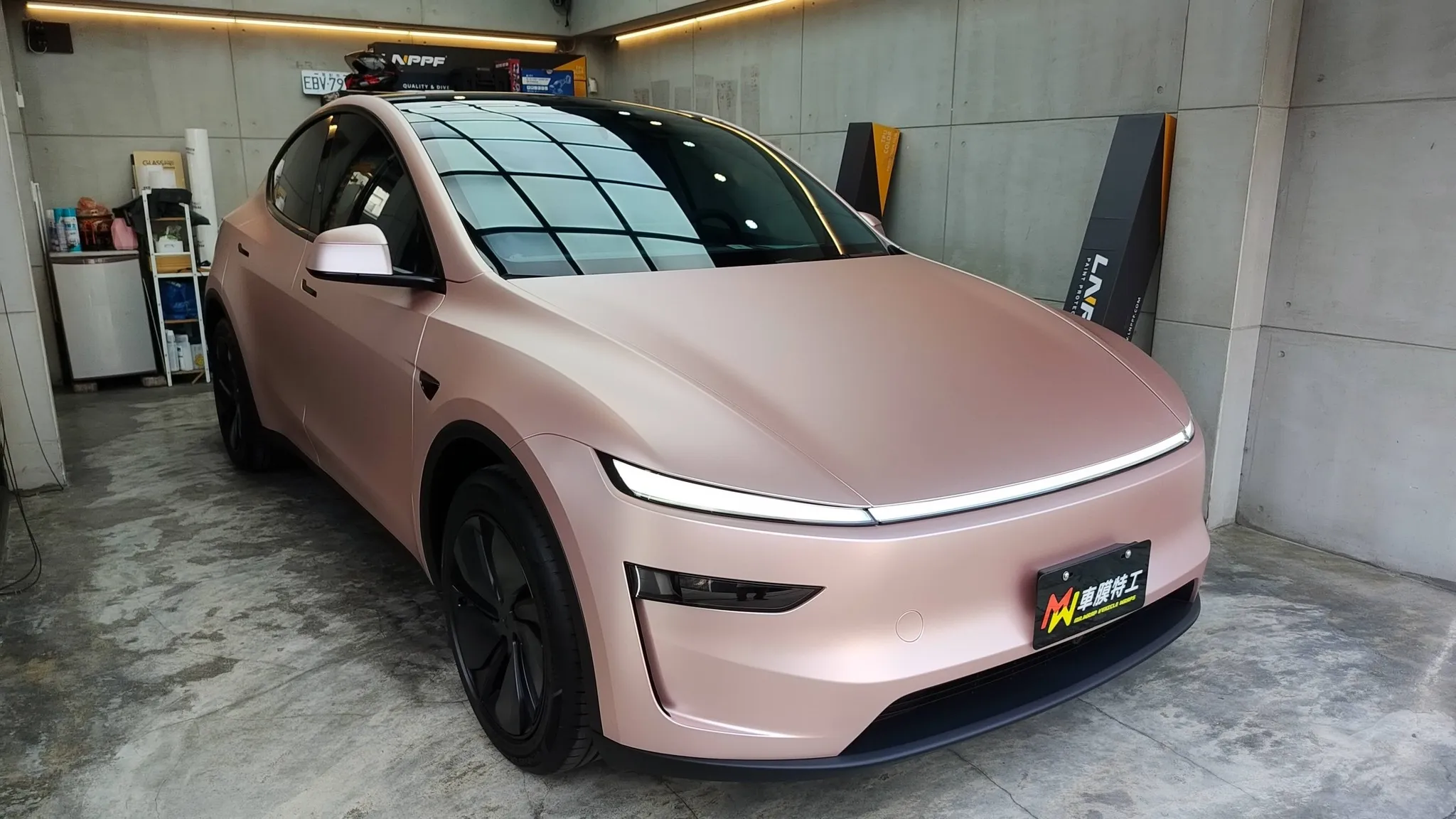 車主早在1月底,就跟我預約3/22交車日進廠落地包改色犀牛皮,我也提早訂購膜料,原本看似順利的貼膜流程,卻被膜料商告知台灣及國外的工廠完全沒貨,要等下一批緞面玫瑰金生產,且不確定船運到貨日期!這輛煥新Y是體貼的先生要送給太太的禮物,而緞面玫瑰金是太太最愛的顏色,如果改選其它顏色,這禮物將會遜色許多....,由於客戶考量後不想延後貼膜的時間,只能考慮換色,於是我訂了第一順位緞面玫瑰金及第二順位有現貨的顏色共2支膜料,並且請LNPPF 的業務緊迫盯人追蹤工廠生產的進度,最後緞面玫瑰金在3/21(六)到台灣,由於物流假日休息,LNPPF 的業務還親自到貨運公司去取貨給我,真的非常給力,順利完工交車!